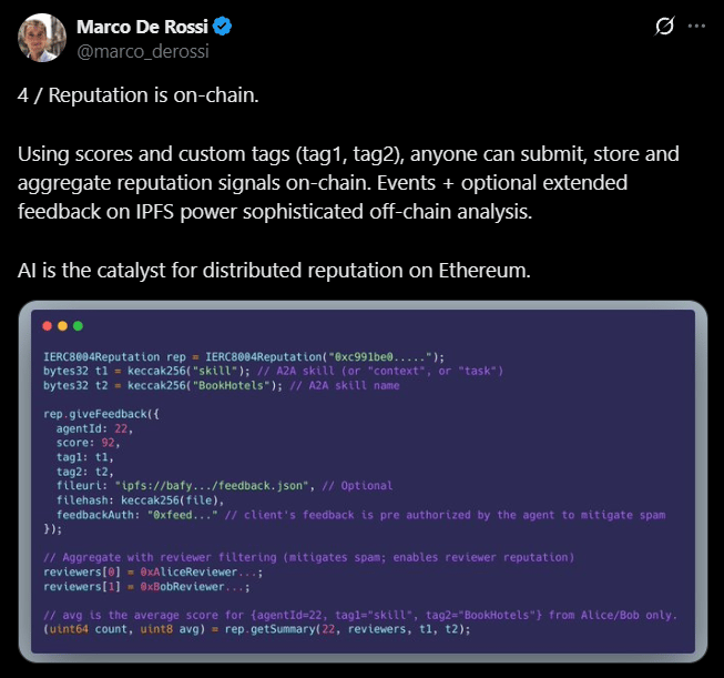 ERC-8004, a new Ethereum technical standard first unveiled this summer, aims to be an answer to all that. The standard is being peer-reviewed and its smart contracts were launched on the Ethereum testnet this month. MetaMask AI Lead Marco de Rossi, Ethereum Foundation AI lead Davide Crapis, Google engineer Jordan Ellis, and Coinbase Developer Platform engineering lead Erik Reppel co-created the protocol, which also incorporates feedback and contributions from a slew of other crypto companies and projects.