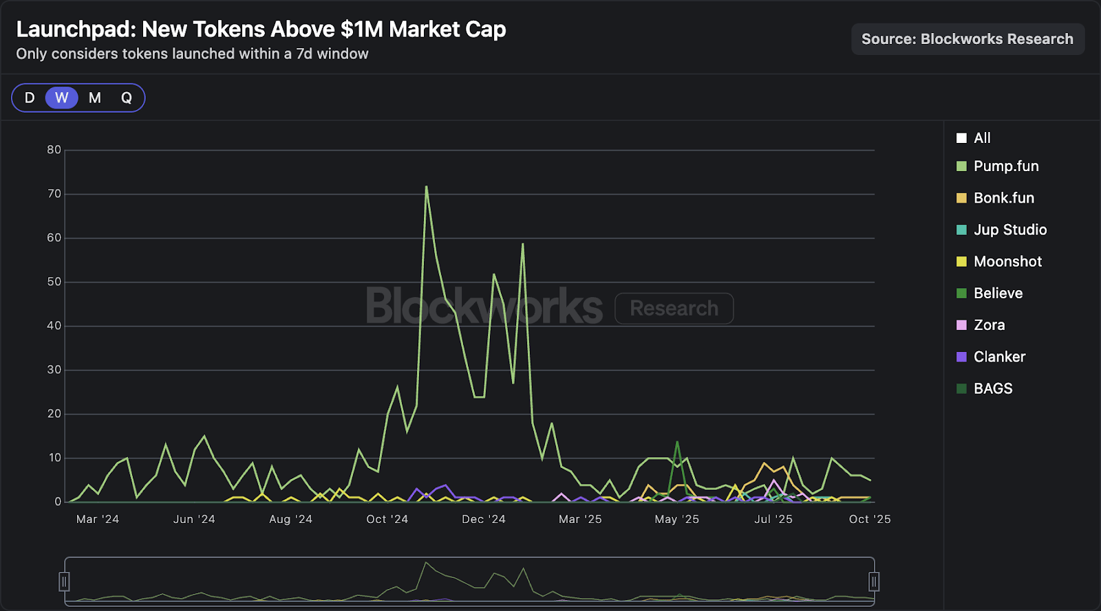 Source: Very few new tokens released via launchpads pass the $1M MC mark each week, but Pumpfun sees the most