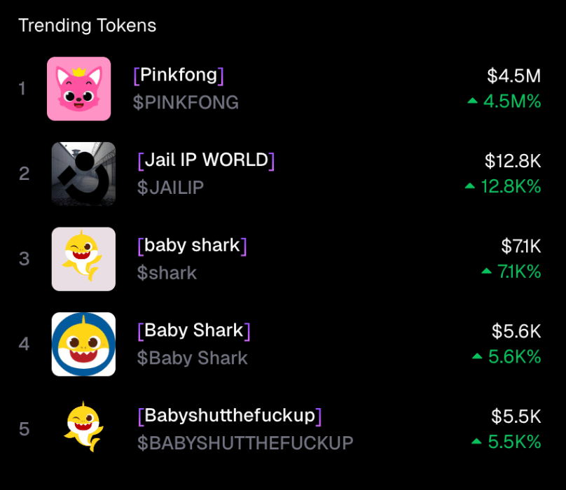 Now, a slew of other (unofficial) memecoins are trending on the platform, including one called “Jail IP WORLD” and another dubbed “Babyshutthefuckup.”